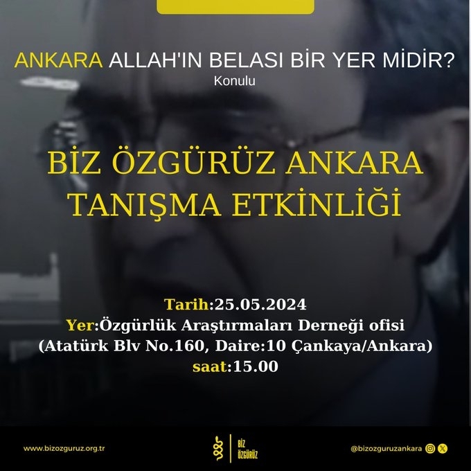 Biz Özgürüz Hareketi olarak, Ankara İl Koordinatörlüğümüzün düzenlediği “Ankara Allah’ın Belası Bir Yer midir?” başlıklı tanışma etkinliğimizi başarıyla gerçekleştirdik.