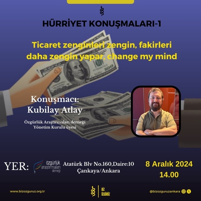 Biz Özgürüz Hareketi olarak, Hürriyet Konuşmaları serimizin ilk buluşması olan “Ticaret zenginleri zengin, fakirleri daha zengin yapar” konulu seminerimizi başarıyla gerçekleştirdik.