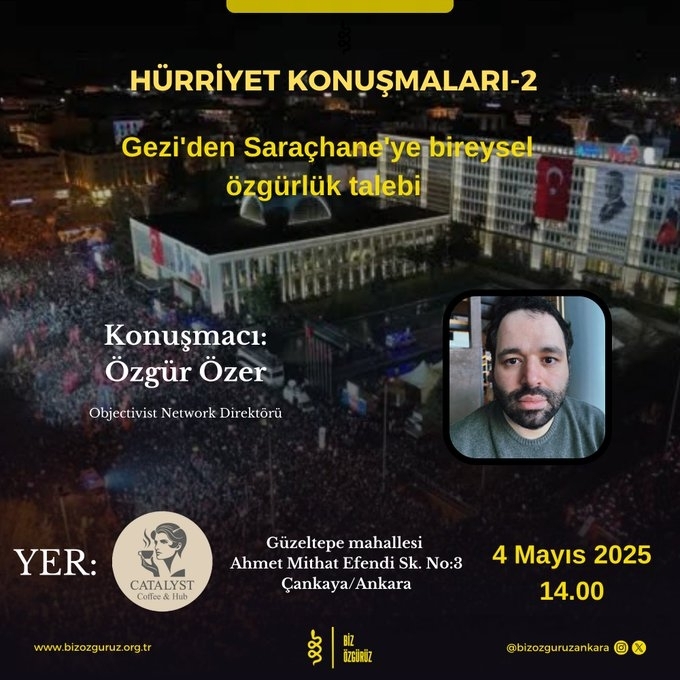 Sayın Özgür Özer’in sunumu, Objektivist felsefenin bireysel özgürlük, sorumluluk ve akıl ilkeleri çerçevesinde Türkiye’deki güncel gelişmeleri değerlendirmesi bakımından büyük ilgi gördü. Etkinliğin soru-cevap bölümünde ise, katılımcılar bireysel haklar, ifade özgürlüğü ve devletin sınırları üzerine derinlikli tartışmalara katkı sundular.